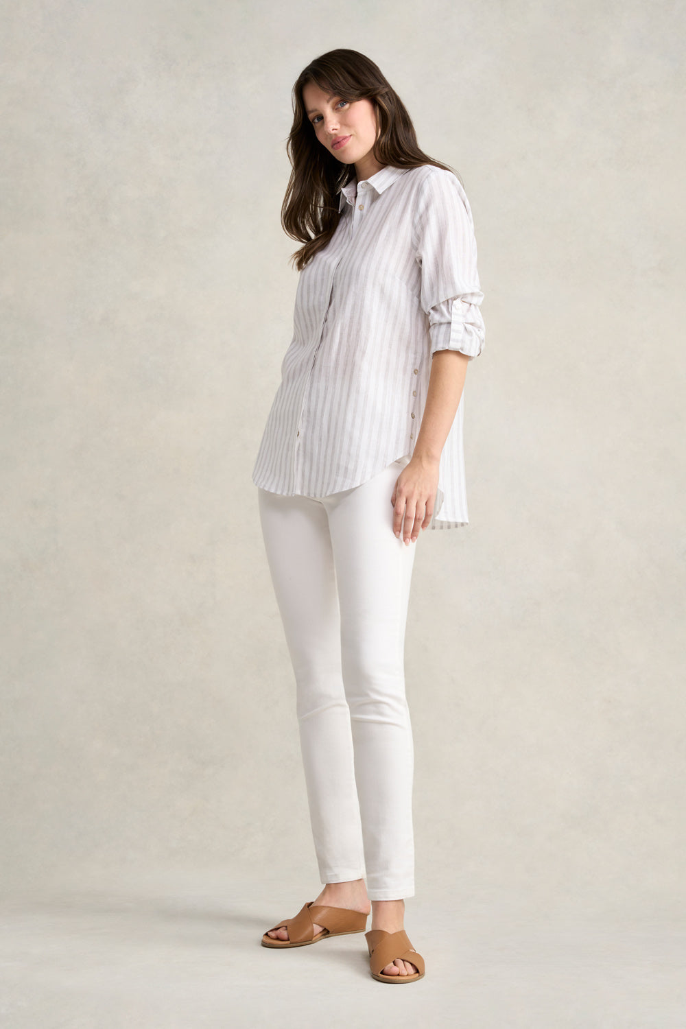 Paris summer fashion is all about chic, clean lines and creating effortless looks. For carefree elegance look no further than our Grey and White striped shirt. It features a flattering curved hem, side button detailing and an optional rolled tab making it perfect for warm days and cooler nights.