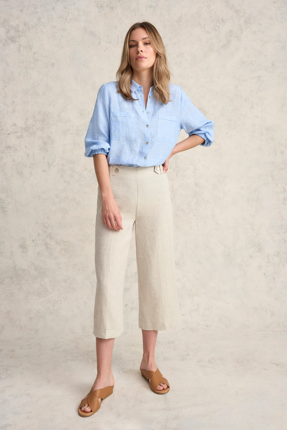 This 100% French linen shirt with natural shell buttons and elasticated cuffs is a light and breathable addition to any outfit. In addition to classic shirt details, it features intricate picot detailing along the pocket and hem. Available in Chambray Cross Dye, this shirt pairs perfectly with our signature Bengajean®.