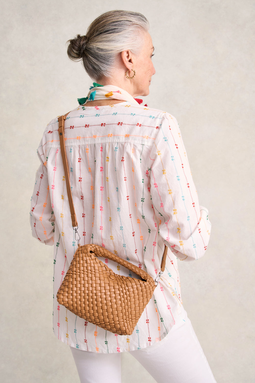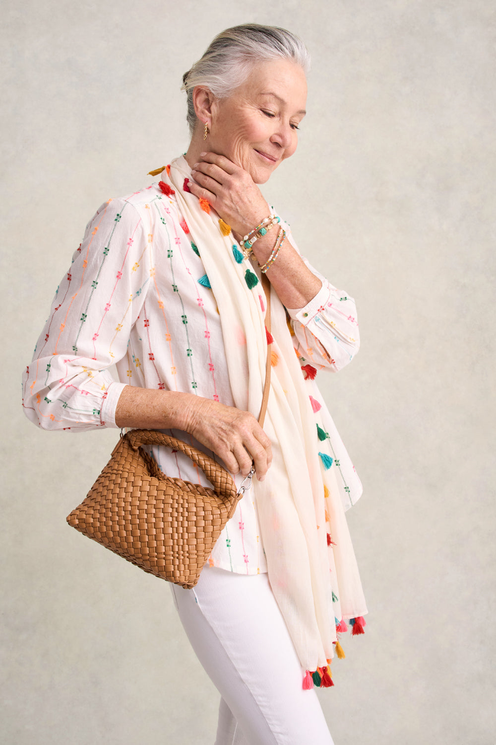 Channeling the glamour of the 1967 Piscina Solari fashion show, our Clip Jacquard Cotton Shirt is a timeless piece. Featuring reversible and removable buttons for versatile outfitting, style this shirt to suit your occasion. Opt for the jewel button in gold and emerald on show or create a more subtle finish with the plain gold side. Other details include a notch neck, long sleeve and flattering high low hem. With a refined silhouette and colourful stripe jacquard finish, this shirt will soon be on high rotation in your summer wardrobe.